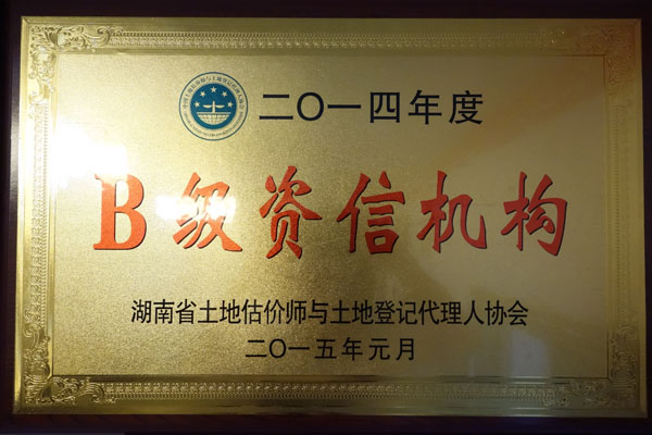 湖南省土地評估機構(gòu)“2014年度B級資信機構(gòu)”