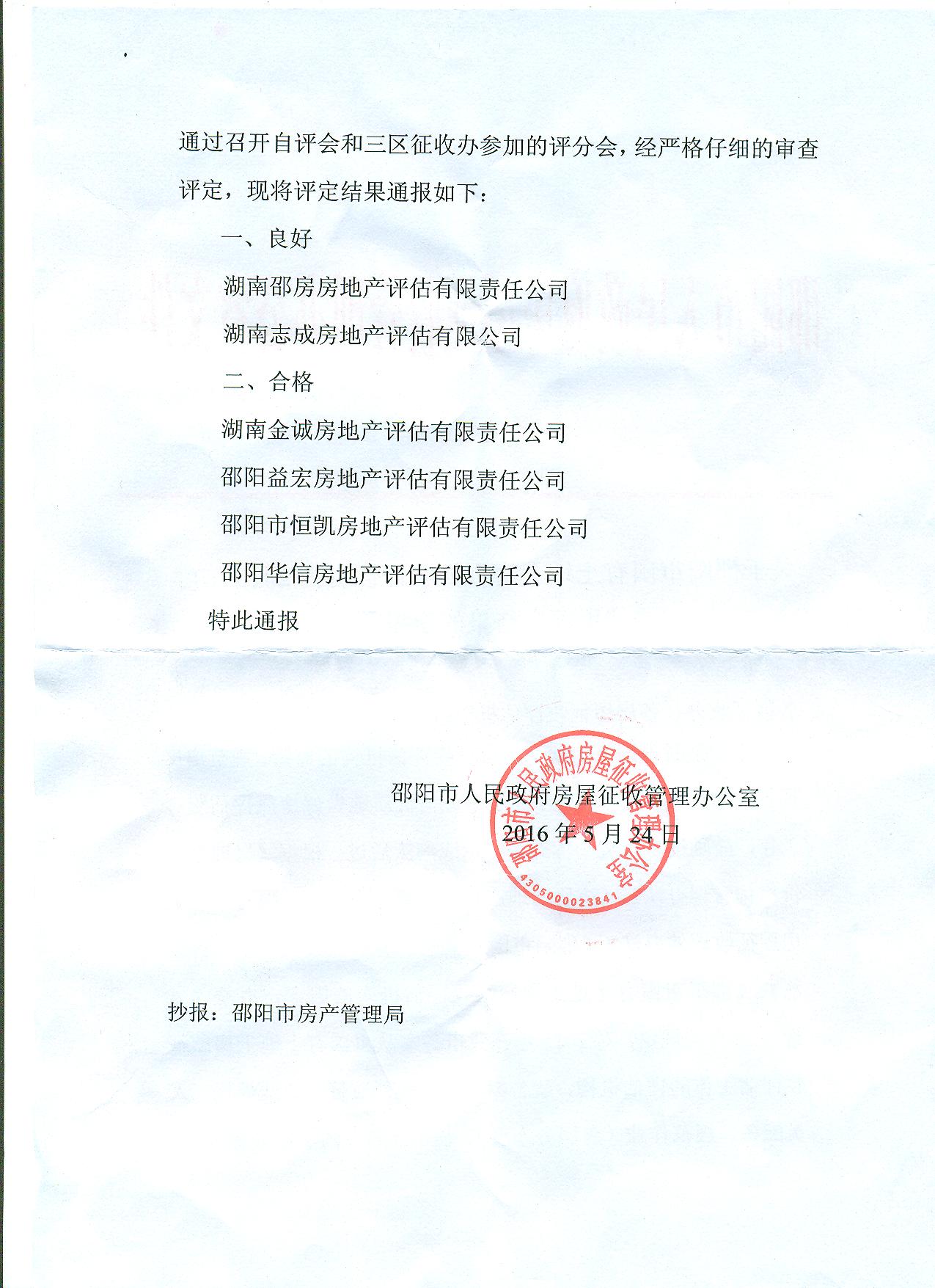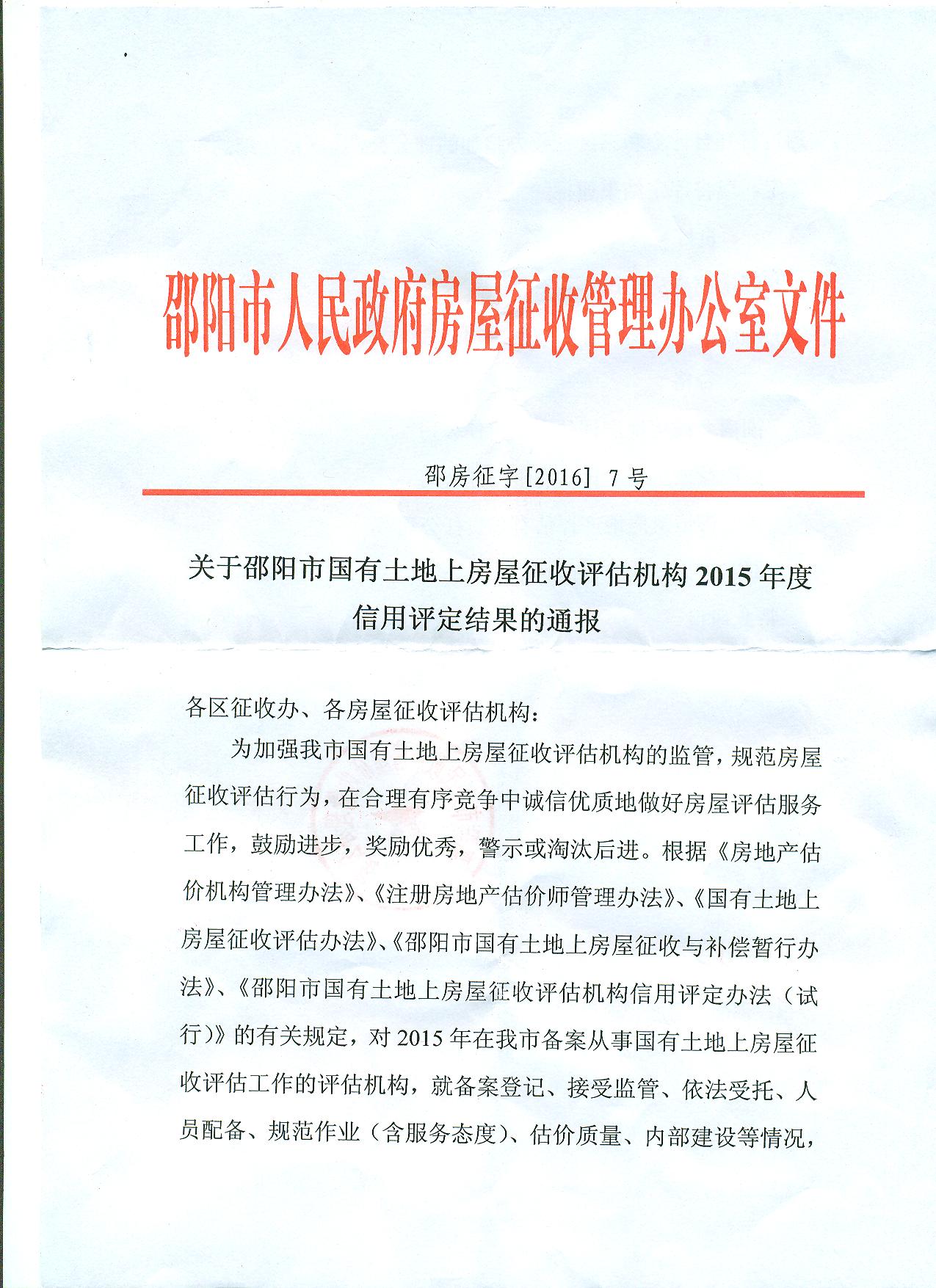 關(guān)于邵陽市國(guó)有土地上房屋征收評(píng)估機(jī)構(gòu)2015年信用評(píng)定結(jié)果的通報(bào)