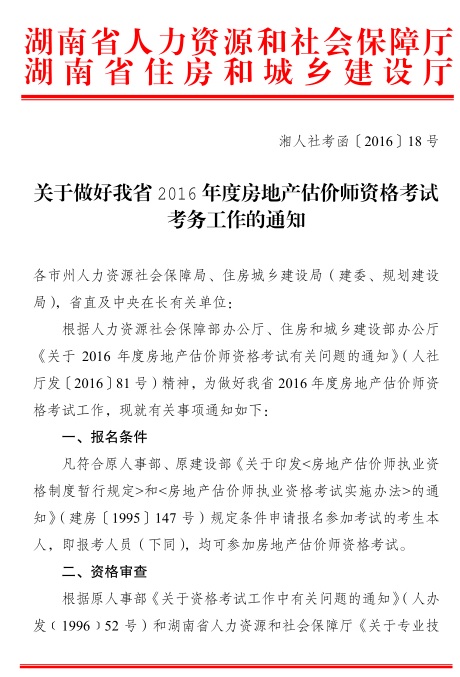 根據(jù)原人事部《關(guān)于資格考試工作中有關(guān)問題的通知》(人辦發(fā)﹝1996﹞52號)和湖南省人力資源和社會保障廳《關(guān)于專業(yè)技術(shù)人員資格考試實行考后資格審查的通知》(湘人社函〔2012〕526號)等有關(guān)文件精神,房地產(chǎn)估價師資格考試實行本人網(wǎng)上報名,報名前報考人員自我資格審查、所在單位資格初審、考試成績公布后人社部門組織資格復(fù)審,資格審查中的具體注意事項見附件1、提交材料要求見附件2。在資格審查過程中,如不符合報考條件或提交虛假信息等,將按照相關(guān)規(guī)定追究責(zé)任(見附件3)。
