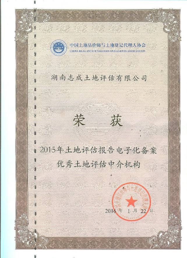2016年1月獲得中國(guó)土地估價(jià)師與土地登記代理人協(xié)會(huì)2015年土地估價(jià)報(bào)告電子化備案優(yōu)秀土地評(píng)估中介機(jī)構(gòu)。
